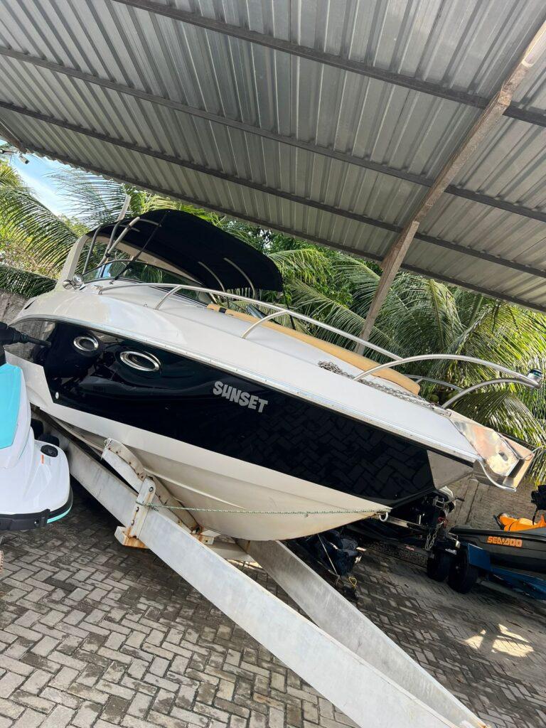 Lancha Ventura 265 Ano 2013 Tamanho 26,5 pés Capacidade 11 pessoas Motor 5.0 V8 Mercruiser Rabeta bravo three com hélice duplo inox Piso em EVA Cabine com banheiro, vaso com descarga elétrica, tv com cromecast inversor, ventilador, mesa de cabine Som completo, completo com 8 autofalantes, 2 subwoofer, 3 módulos, processador, Drive T.i fonte digital JFA 120 duas baterias de 150 amperes chave geral para duas baterias independentes churrasqueira mesa de apoio para churrasco 4 lâmpadas subaquática barra de led na proa barco completamente rés usado, bem cuidado, para pessoas exigentes R$229.990,00